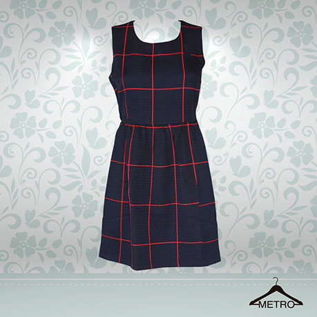 Vestido de mujer color azul marino con lineas rojas.